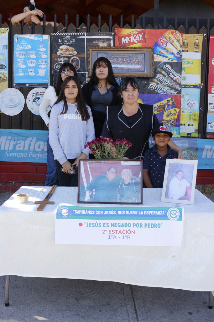 Desde los más pequeños hasta adultos mayores, toda la comunidad se hizo parte de este recorrido espiritual que comenzó en las inmediaciones del colegio y culminó en nuestra capilla. En cada estación, estudiantes y familias se encargaron de representar un momento del camino de Jesús hacia la cruz, como como lo fue en la 6ª estación: “Jesús se encuentra con su madre”, donde un grupo de estudiantes presentó con respeto y dedicación este emotivo pasaje.